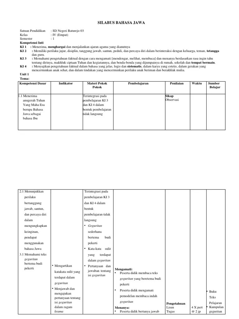 Silabus Bahasa Jawa Kelas 4 Semester 2 / Silabus Bahasa Jawa Kelas 6 Semester 1dan 2