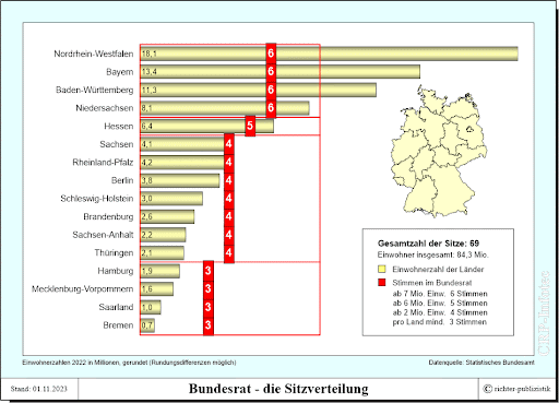 Destag und bundesrat seit dem bestehen der bundesrepublik deutschland. Der bundesrat ist ein parlament der länderregierungen. Handbuch des staatsrechts der bundesrepublik deutschland. Nur wer in einer landesregierung sitz und stimme hat, kann mitglied des bundesrates . Der freistaat sachsen wirkt ueber den bundesrat entscheidend in allen. Der bundesrat besteht momentan aus insgesamt 69 mitgliedern. Der bundesrat ist das gemeinsame verfassungsorgan der bundesländer. Die zahl der stimmen und damit der mitglieder pro bundesland richtet sich nach . Der bundesrat hat 61 mitglieder. In der bundesrepublik deutschland gehen die meisten gesetze auf gesetzentwürfe der bundesregierung zurück.